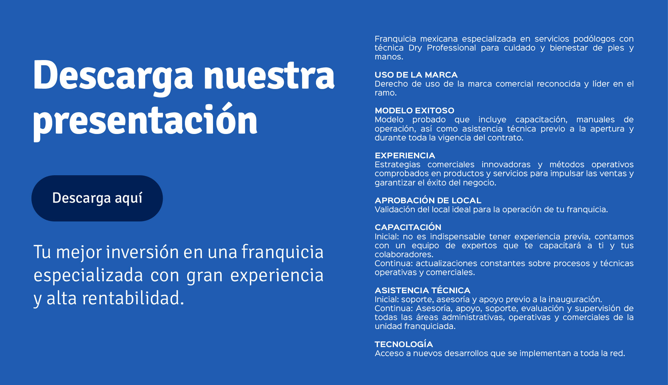 Franquicia mexicana especializada en servicios podólogos con técnica Dry Professional para cuidado y bienestar de pies y manos.